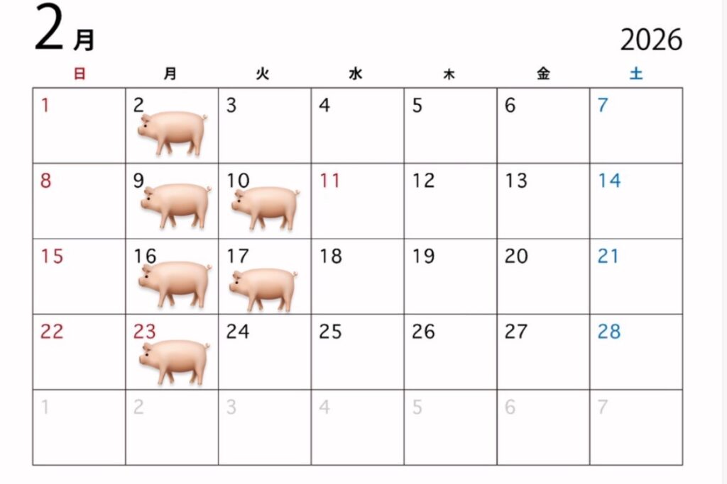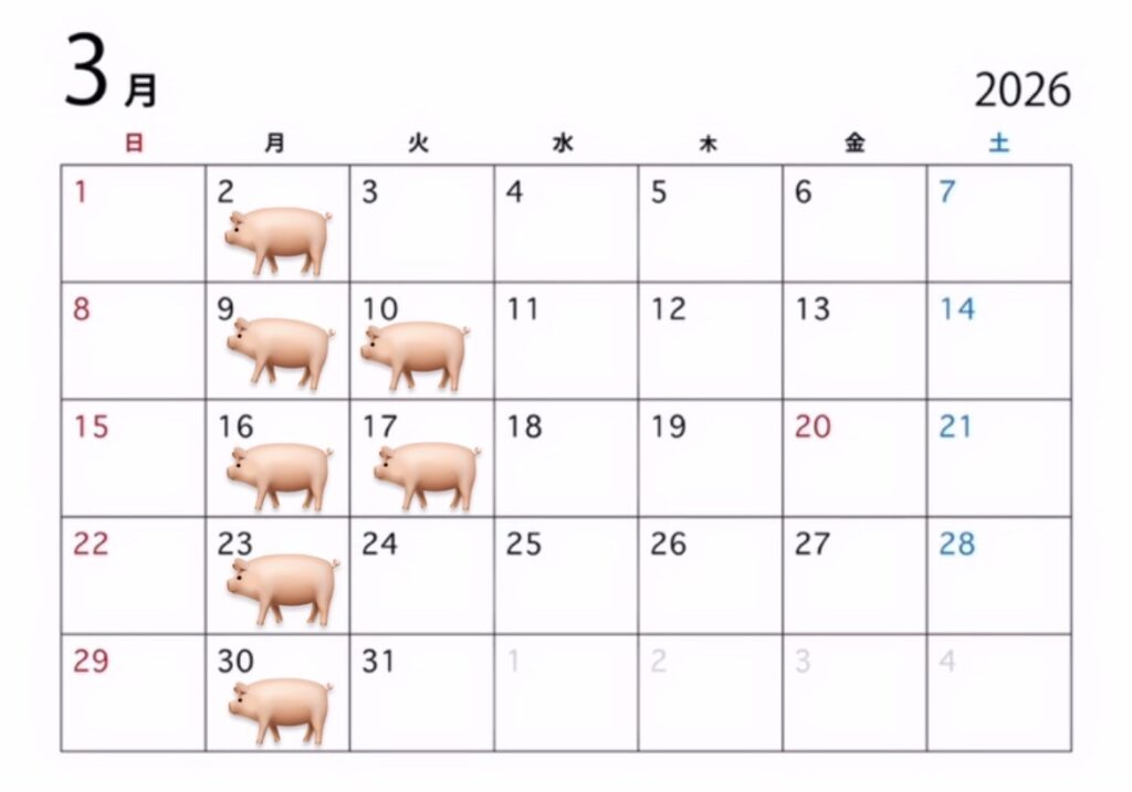 2月・3月の定休日のおしらせです ブタさんマークの日がお休みです